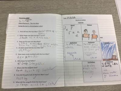 - Vocabulary Exploration- Each lesson focuses on 10 carefully selected, challenging vocabulary words drawn from the text. These tier 2 or tier 3 words are explored in context, discussed and defined collaboratively. The words are then displayed in the classroom and revisited to help build a growing bank of ambitious vocabulary.